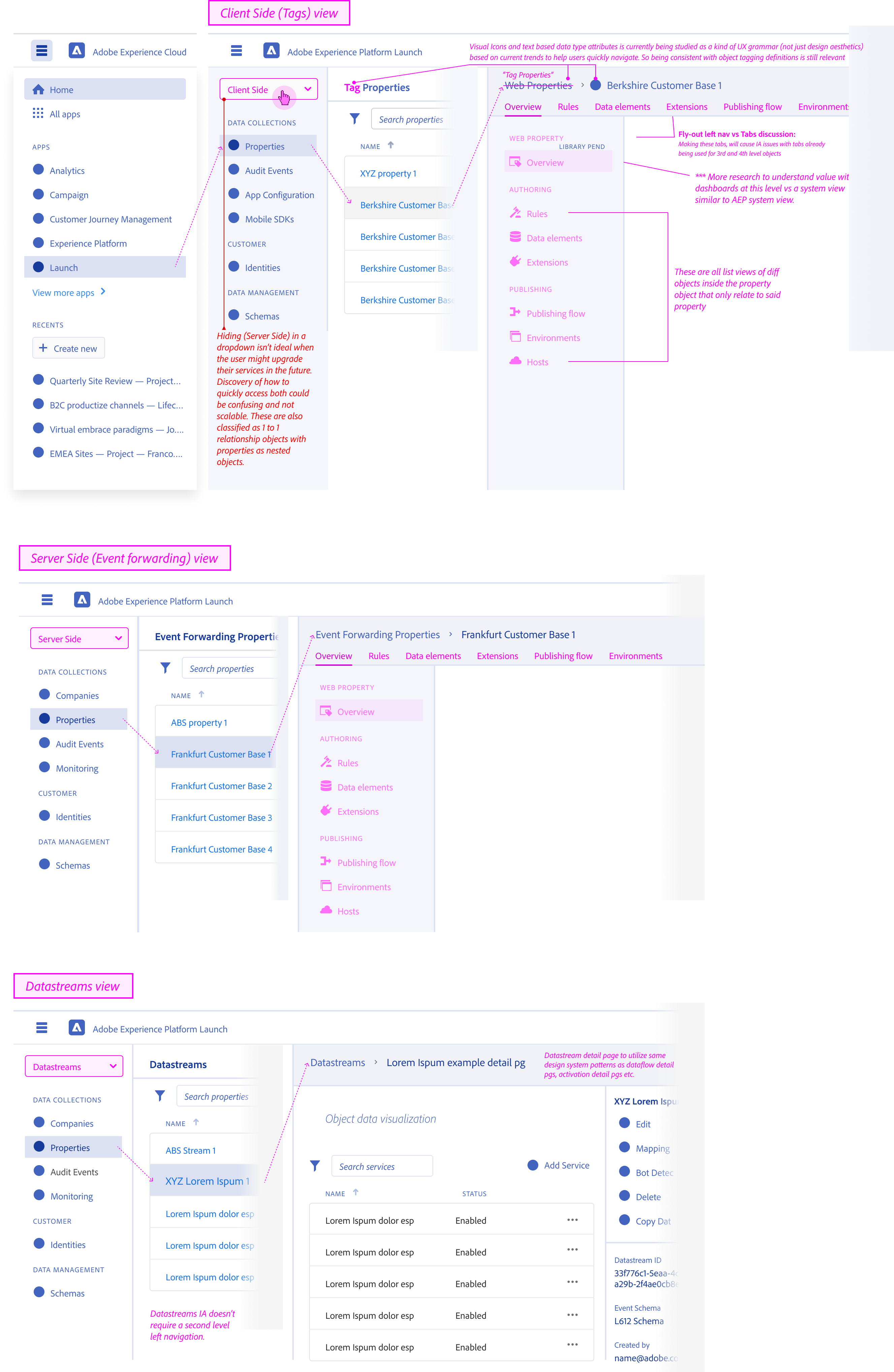 I explored multiple navigation and workflow integration models. Focused on how to embed Data Collection within AEP’s shell while retaining Launch familiarity. Defined left-rail navigation patterns, waffle switcher flows, and progressive disclosure states that would scale with future services. These were designed to unify ingestion and mapping workflows with existing AEP data mapping patterns while preparing for upcoming features like serer-side tagging.