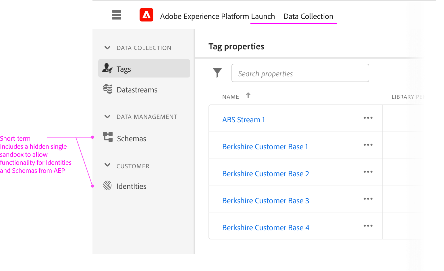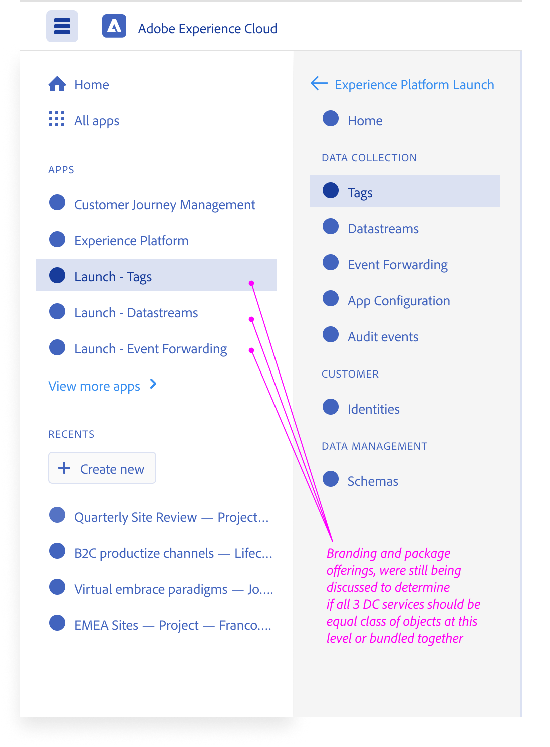 Keep Launch terminology and main navigation in AEC, and add 2 levels of left navigation with a dropdown to toggle services. This would allow second level left navigation to remain as is for Tag management objects. This was discussed as a short-term fix, but communicated the dropdown is not ideal for scalability of Data Collection’s future portfolio of services.