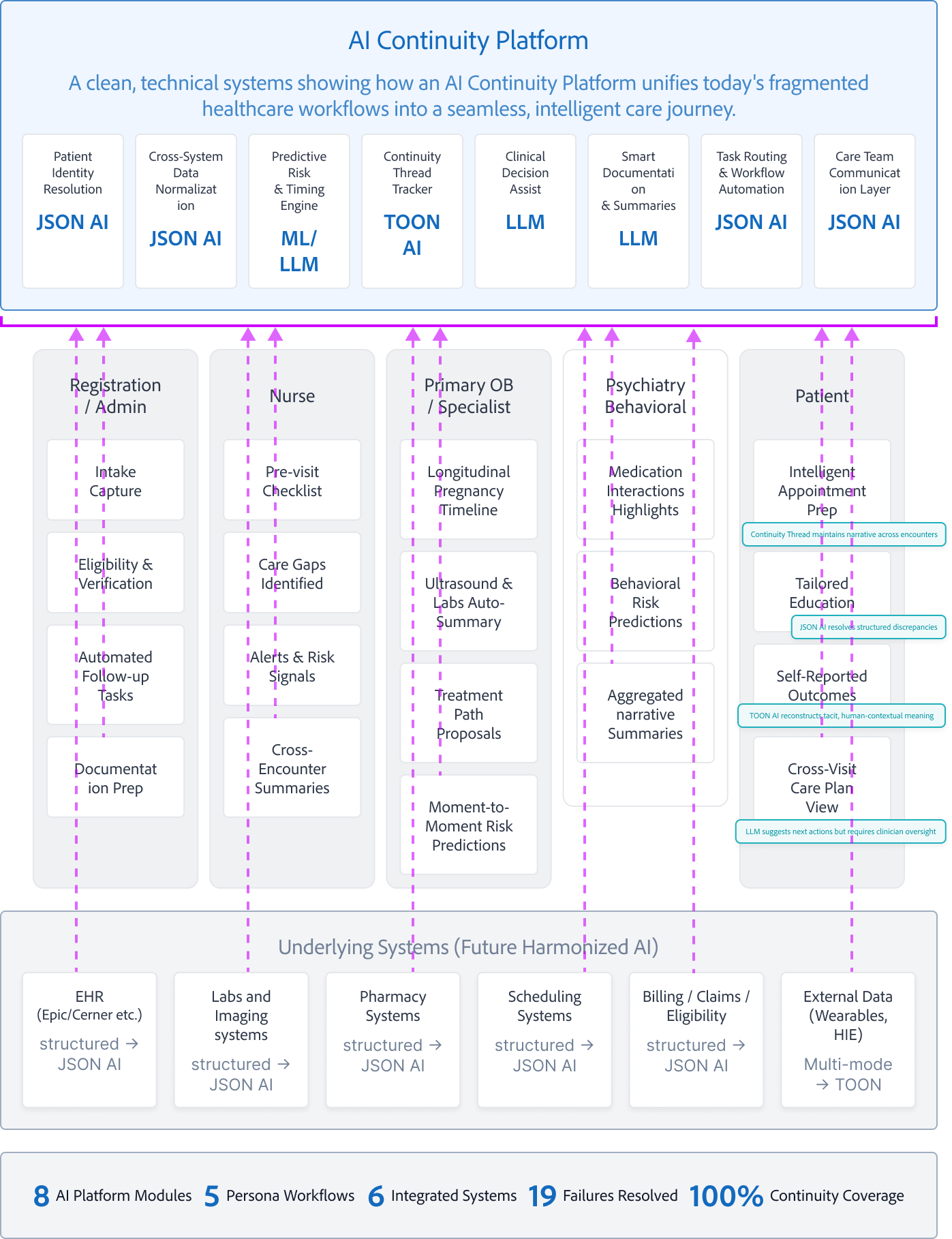 A clean, technical systems showing how an AI Continuity Platform unifies today's fragmented healthcare workflows into a seamless, intelligent care journey.