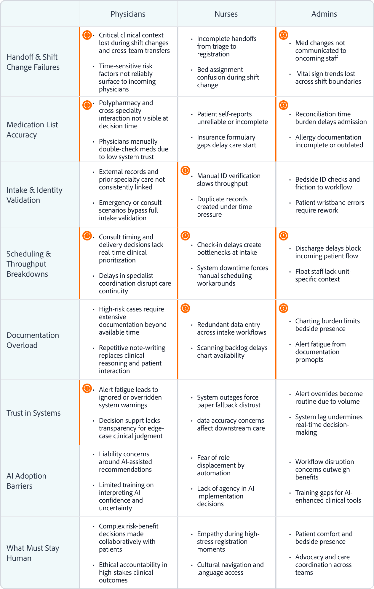 Patterns observed across clinicians, operations, and frontline care during discovery interviews